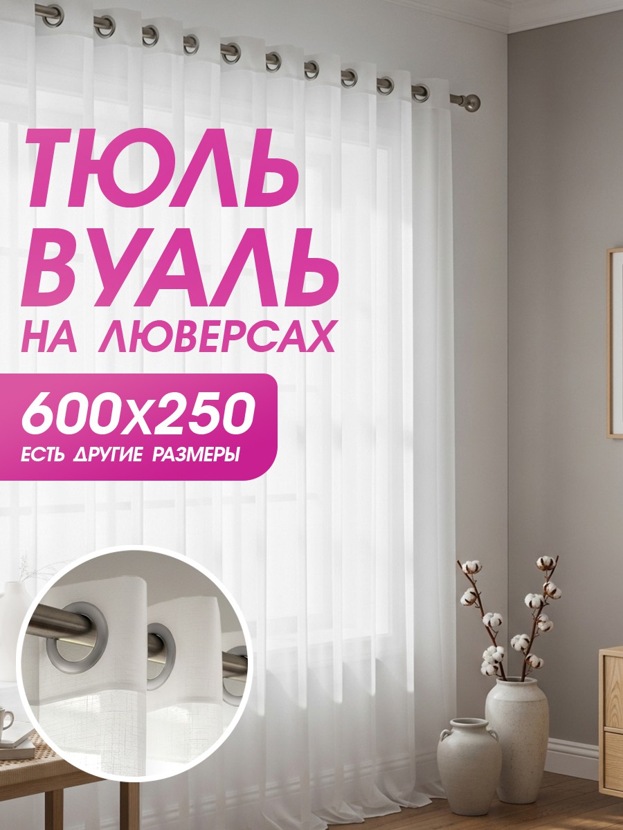 Тюль вуаль на люверсах — элегантный выбор для современного дома. Готовый тюль из плотного 100% полиэстера не мнется и держит форму. Одно полотно 600х250 см со серебристыми люверсами диаметром 3,5 см легко крепится на карниз (штангу, трубу). Занавеска формирует красивые мягкие складки. Тюль на люверсах отлично пропускает воздух и мягко рассеивает свет, создавая уют. Тюлевая шторка украсит окно в гостиной, зале, спальне, детской или на кухне. Этот широкий и длинный тюль можно использовать один или с портьерами. Он идеален для стилей прованс, скандинавский и минимализм. Тюль вуаль на кольцах дает красивую объемную драпировку с коэффициентом 2-2.5. Занавески и тюлевые шторы из вуали просты в уходе и дарят комфорт. Гардины с люверсами — это стильное и практичное решение для интерьера, а также отличный подарок на свадьбу или новоселье.